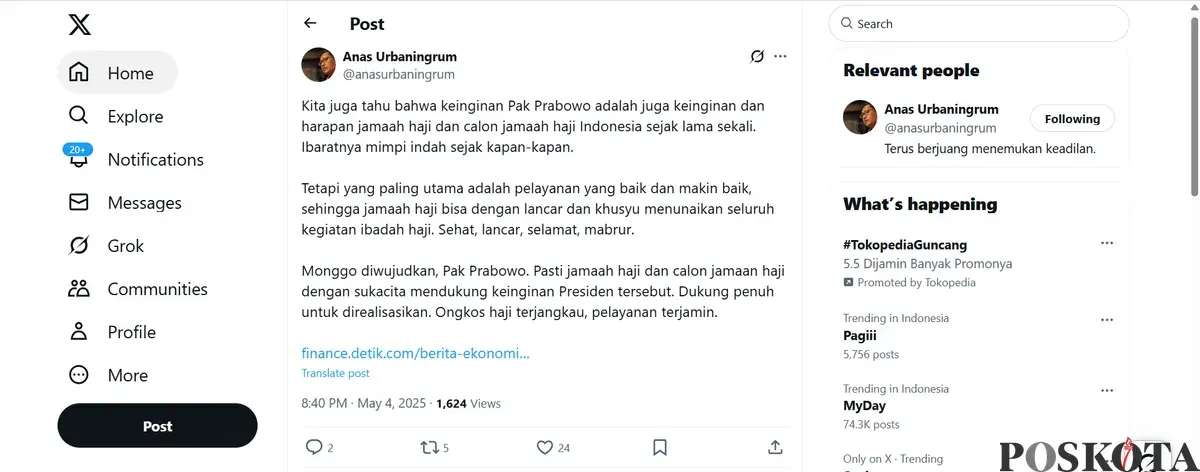 “Kita juga tahu bahwa keinginan Pak Prabowo adalah juga keinginan dan harapan jamaah haji dan calon jamaah haji Indonesia sejak lama sekali. Ibaratnya mimpi indah sejak kapan-kapan,” tulisnya di akun X @anasurbaningrum seperti dilansir Poskota pada Senin, 5 Mei 2025.