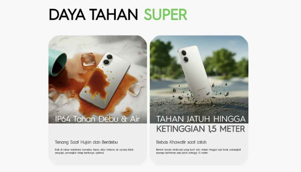 Dengan sertifikasi ketahanan debu dan air IP64 serta klaim tahan banting dari ketinggian 1,5 meter, ponsel ini dibekali untuk menghadapi penggunaan kasar dalam keseharian, sebuah fitur langka yang membuatnya unggul di kelasnya.