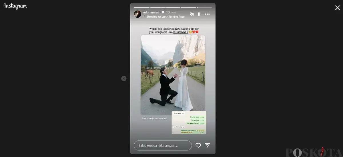 Melalui akun Instagram pribadi, Rizkina Nazar membagikan ulang foto saat El Rumi melamar Syifa Hadju secara romantis di Swiss.