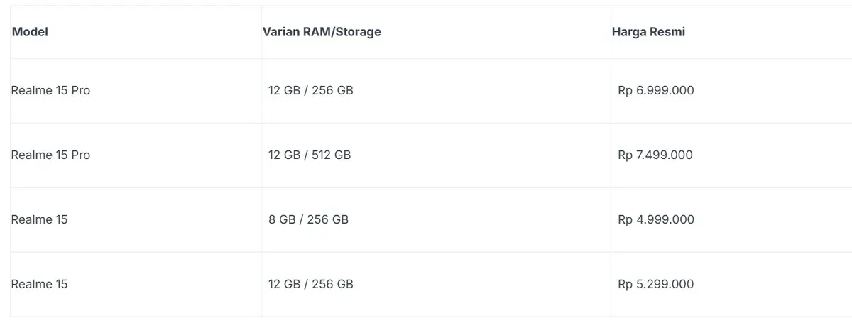Perbedaan spesifikasi tentu berpengaruh pada harga jual. Berikut harga resmi Realme 15 series di Indonesia:
