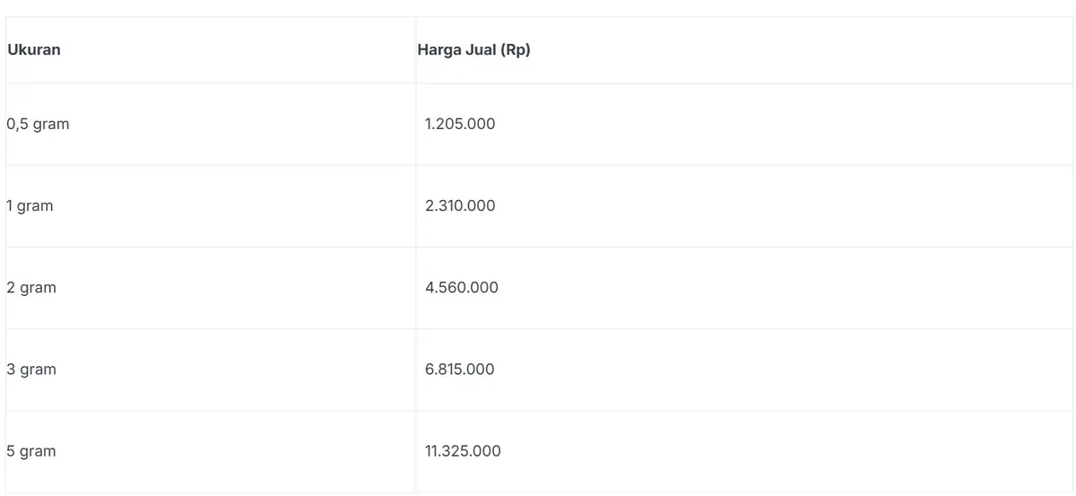 Perlu diingat bahwa harga emas bersifat dinamis dan dapat berubah setiap hari mengikuti perkembangan harga emas dunia, kurs rupiah terhadap dolar AS, dan kebijakan fiskal dalam negeri.