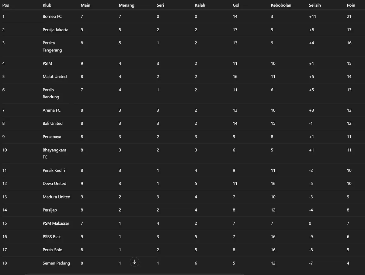 Sementara itu, Borneo FC Samarinda menjadi satu-satunya tim yang masih sempurna musim ini. Hingga pekan ke-10, mereka telah mengoleksi 21 poin dari tujuh pertandingan — hasil dari tujuh kemenangan beruntun tanpa sekalipun kehilangan angka.