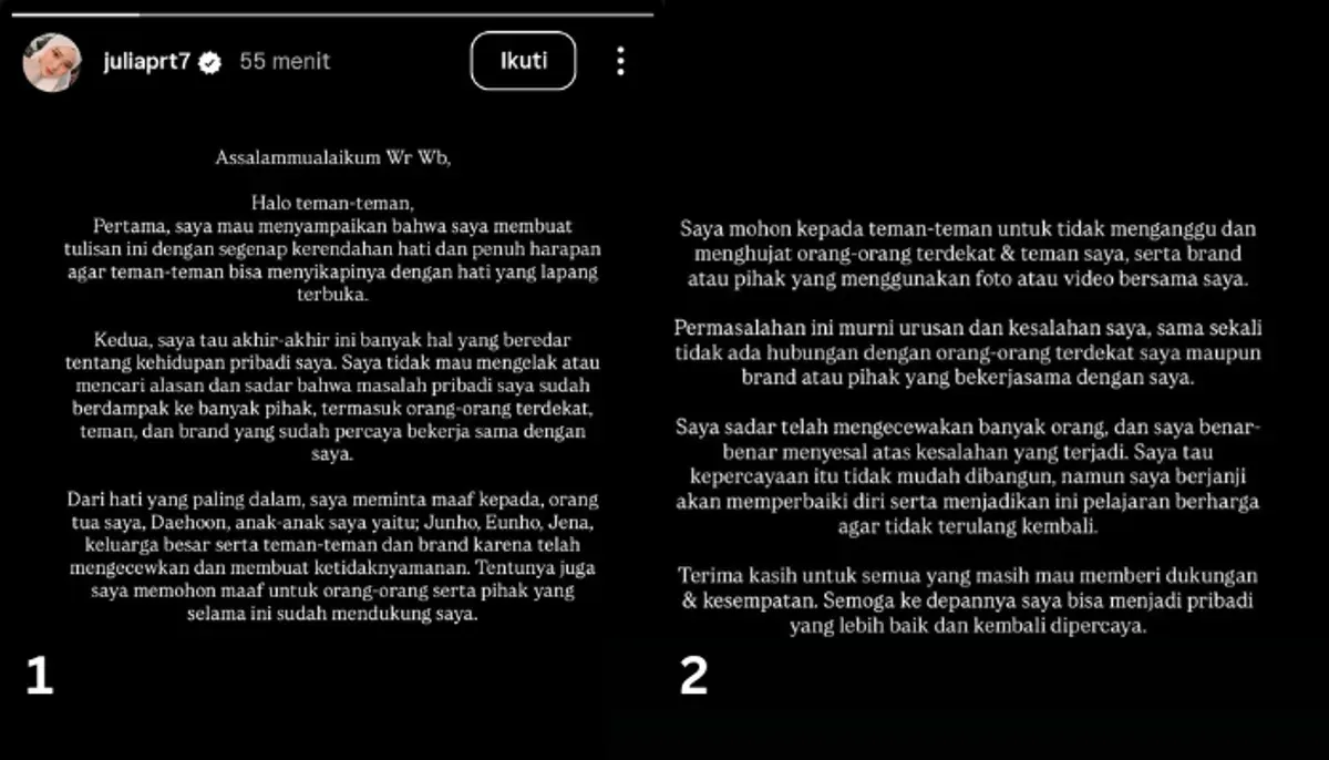 Klarifikasi dan permintaan maaf Jule tersebut disampaikan melalui unggahan panjang di fitur Instagram Story-nya pada Minggu, 26 Oktober 2025.