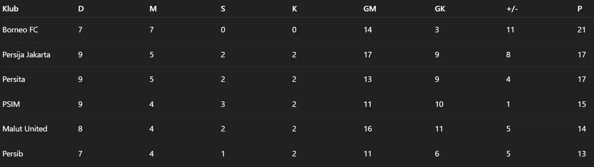 Berikut klasemen terbaru hingga pekan ke-9: