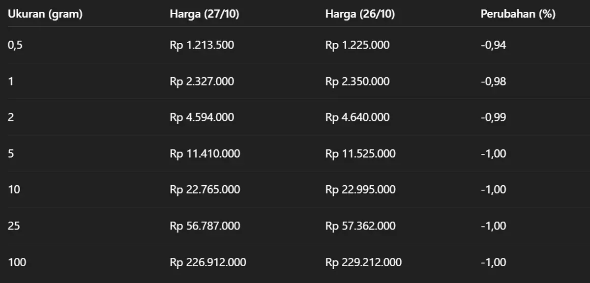 Berdasarkan data resmi dari Logam Mulia Antam, pada Senin, 27 Oktober 2025, harga emas tercatat di Rp 2.327.000 per gram, atau turun tipis Rp 23.000 dibanding hari sebelumnya. Meskipun terlihat sebagai penurunan harian sekitar 0,98%, tren jangka menengahnya masih positif sebab harga emas sebulan lalu masih di kisaran Rp 2.191.000 per gram.