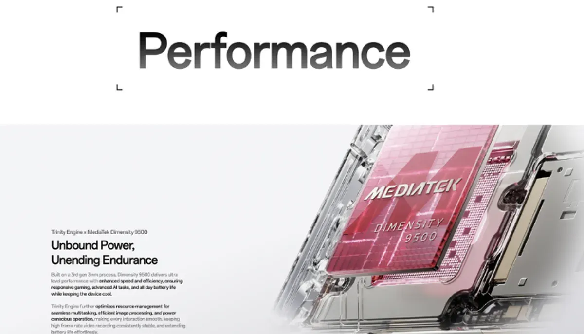 Di balik bodinya yang ramping, Find X9 Pro ditenagai chipset MediaTek Dimensity 9500 berarsitektur 3nm. Konfigurasi All-Big-Core pada chipset ini diklaim meningkatkan performa hingga 32% dengan efisiensi daya optimal.