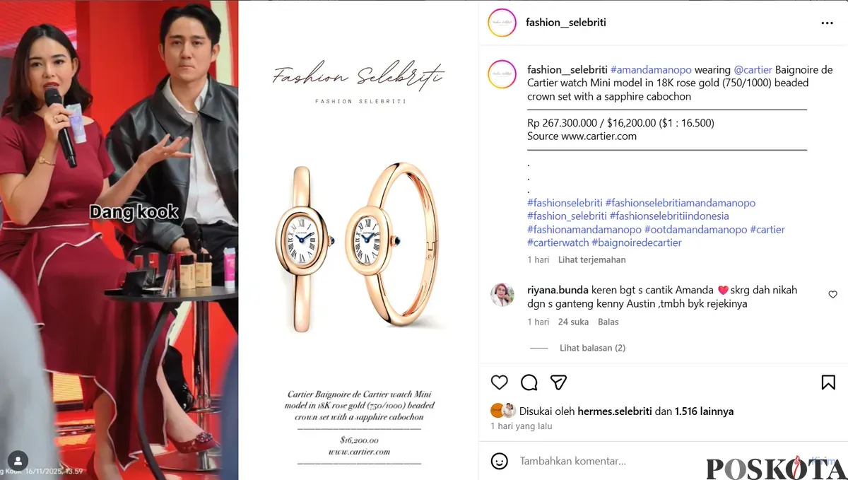“#amandamanopo wearing @cartier Baignoire de Cartier watch Mini model in 18K rose gold (750/1000) beaded crown set with a sapphire cabochon Rp 267.300.000 / $16,200.00 ($1 : 16.500) Source www.cartier.com,” kata akun itu.