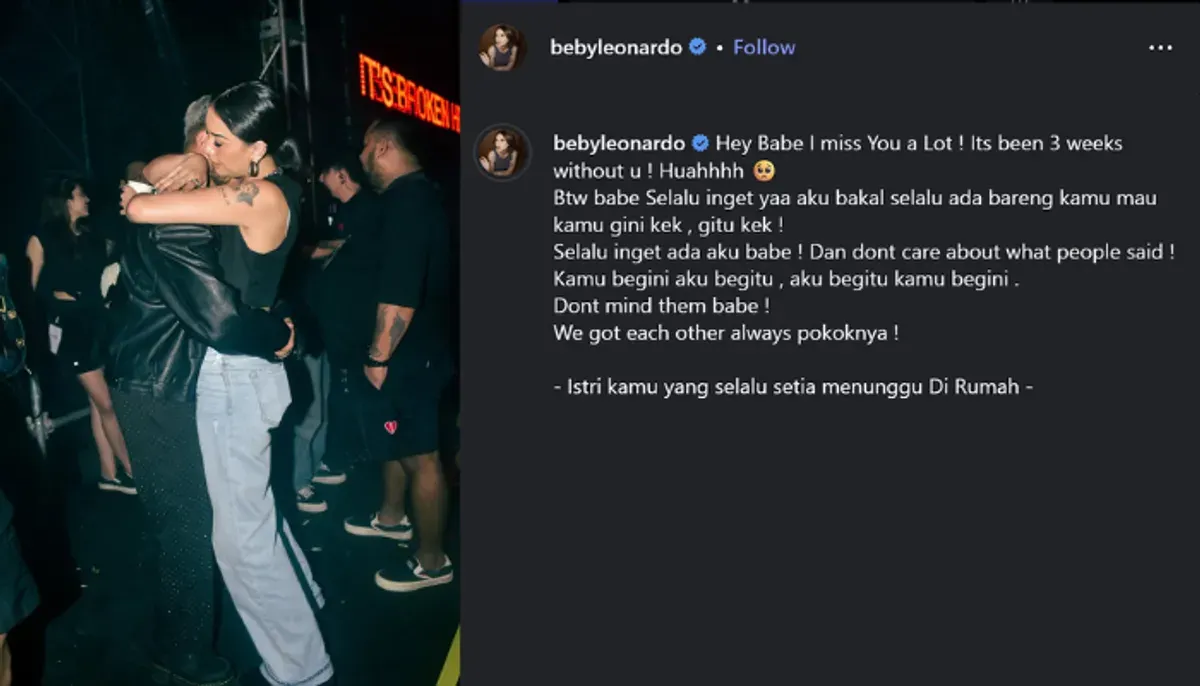 "Hey Babe I miss you a lot! Its been 3 weeks without u ! Huahhhh," tulis Beby Prisillia, menggambarkan betapa ia merasakan kehampaan tanpa kehadiran sang suami.
