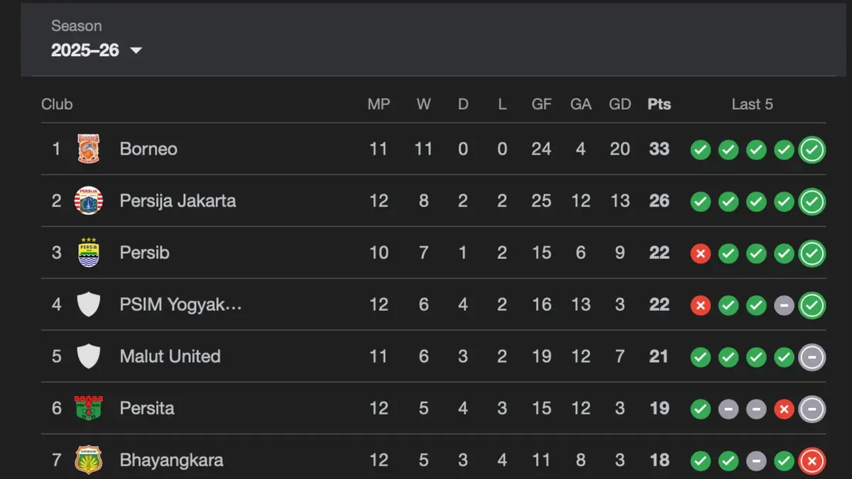 Lebih lanjut, Persib Bandung menyusul di posisi ketiga dengan raihan 22 poin dan memiliki catatan tujuh kemenangan, satu imbang dan dua kalah.