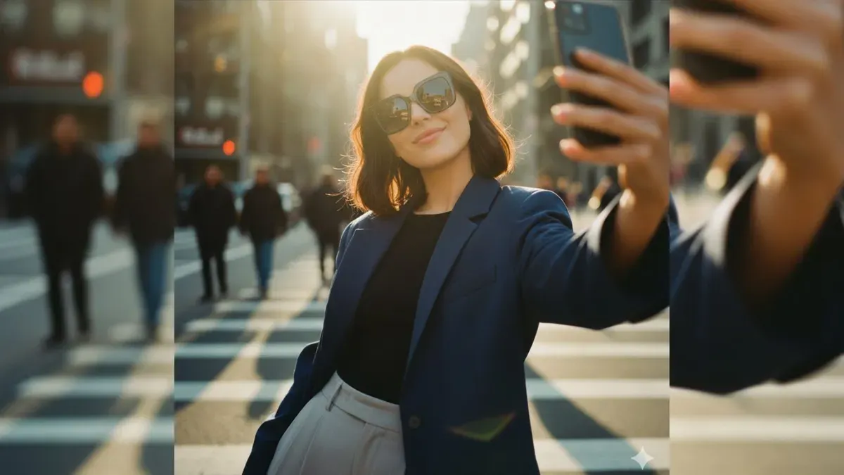 Swafoto sudut rendah (low angle) dengan blazer oversized, kacamata besar, dan latar kota yang cerah. Pencahayaan golden hour memberikan atmosfer sinematik yang elegan.