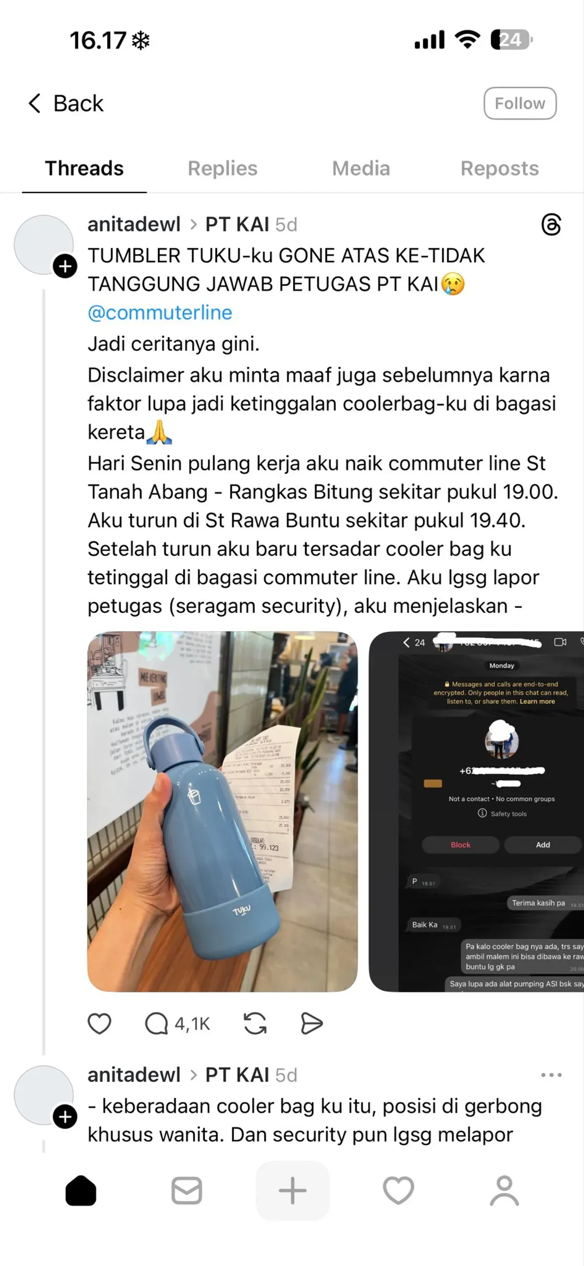 “Aku turun di Stasiun Rawa Buntu sekitar pukul 19.40. Setelah turun aku baru tersadar cooler bag ku tetinggal di bagasi commuter line. Aku langsung lapor petugas (seragam security), aku menjelaskan," tulis Anita.