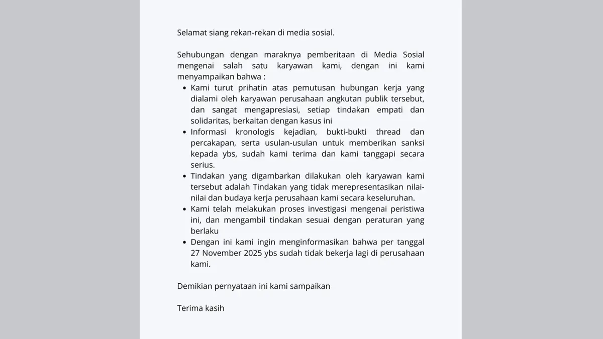 Merebaknya isu pemecatan Argi akhirnya ditanggapi langsung oleh KAI Commuter. VP Corporate Secretary KAI Commuter, Karina Amanda, menegaskan bahwa tidak ada pemutusan hubungan kerja terhadap Argi.