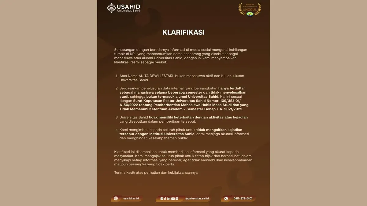 Dalam unggahan di akun @universitas.sahid, pihak kampus menegaskan bahwa ANITA DEWI LESTARI bukan mahasiswa aktif maupun alumni Universitas Sahid.