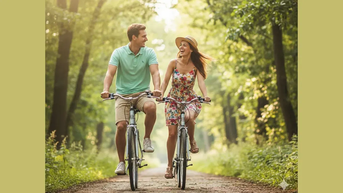 "Pasangan bersepeda di jalur teduh, suasana akhir pekan, gaya candid berwarna vibrant namun lembut."
