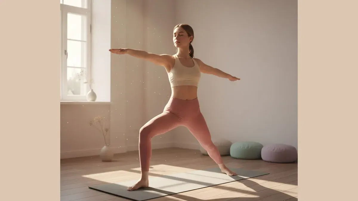 "Perempuan melakukan yoga di atas mat minimalist, pencahayaan tenang Minggu pagi, palet warna pastel, gaya fotografi hyper-realistic."