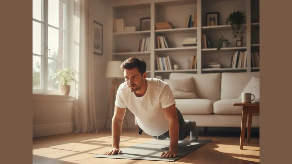 "Pria melakukan workout ringan di ruang keluarga yang cozy, energi 'slow morning', cahaya alami dari jendela, estetika gaya hidup."