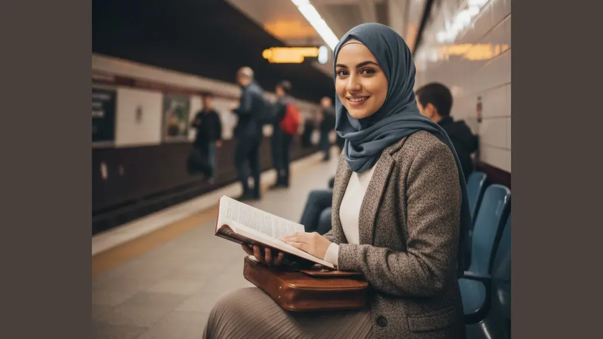 "Buat gambar vertikal realistik 4K dengan kamera smartphone Android. Tampilkan figur perempuan berhijab bergaya mahasiswa Oxford yang sedang duduk membaca buku di stasiun kereta bawah tanah. Figur tersenyum ke arah kamera. Atur pencahayaan agar menyatu dengan tone foto dan terlihat natural."