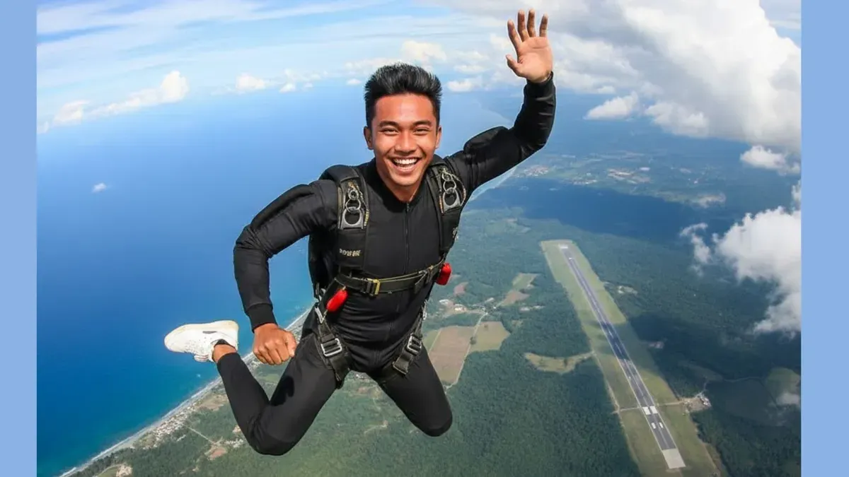 Prompt: "Buatkan foto yang menampilkan seorang pria muda Indonesia sedang melayang di udara saat melakukan skydiving. Pria tersebut memiliki rambut hitam pendek dan senyum lebar yang menampilkan kebahagiaan dan semangat. Dia mengenakan atasan dan celana ketat berwarna hitam, serta sepatu sneakers putih. Di tubuhnya, terpasang sabuk dan perlengkapan skydiving berwarna hitam. Latar belakang foto memperlihatkan pemandangan dari ketinggian: lautan biru jernih yang berbatasan dengan daratan hijau. Di daratan, terlihat area dataran, perbukitan yang ditutupi pepohonan hijau, serta sebuah landasan pacu yang memanjang. Langit dipenuhi dengan awan putih yang tebal dan dramatis. Pria itu mengangkat satu tangannya, seolah-olah menyapa atau melambaikan tangan ke arah kamera, yang memberikan nuansa petualangan dan kebebasan."
