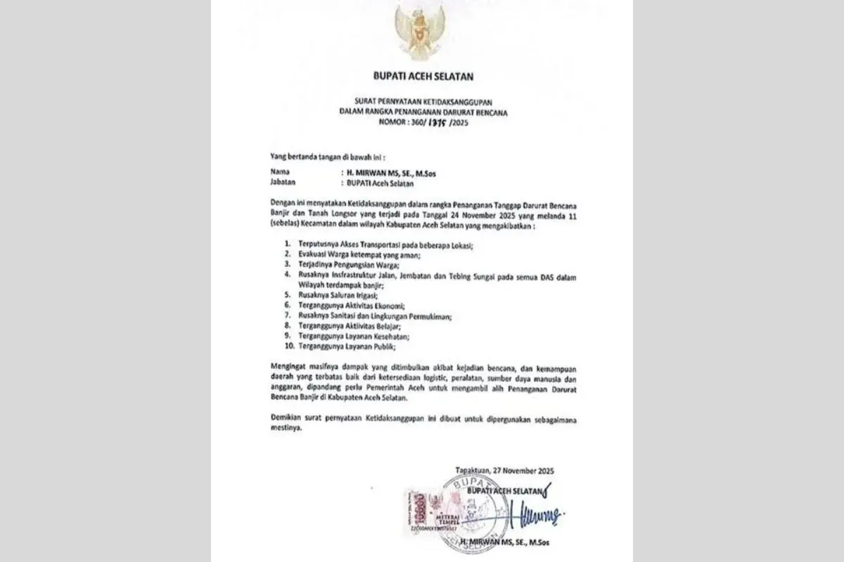 Pemerintah pusat pun disebut sedang meninjau langkah disipliner yang memungkinkan. Dengan kondisi pemulihan bencana yang masih berlangsung, masyarakat Aceh Selatan berharap perhatian para pemimpin daerah kembali terfokus pada penanganan korban dan upaya rekonstruksi.