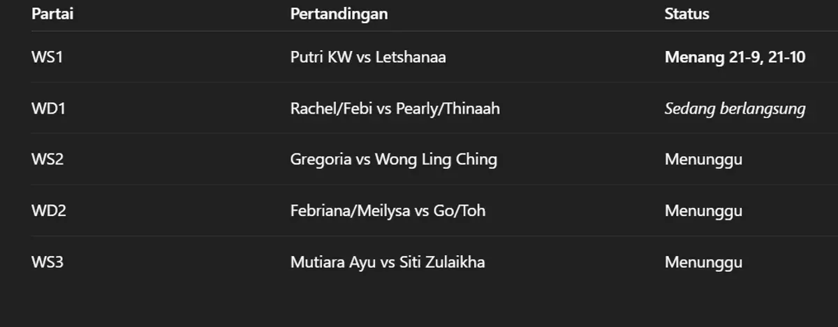 Jika pertandingan berlanjut, Gregoria Mariska Tunjung menjadi tumpuan pada partai ketiga. Ia akan berhadapan dengan pemain muda Malaysia: Wong Ling Ching.