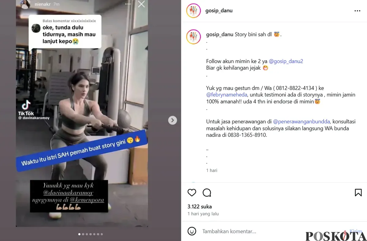 Dilansir Poskota melalui akun Instagram @gosip_danu, ternyata sang istri sempat mengunggah foto Davina ketika berolahraga di gym Kemenpora.
