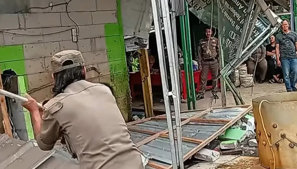 CILEUNGSI, POSKOTA.CO.ID - Satpol PP Kabupaten Bogor membongkar 15 lapak Pedagang Kaki Lima (PKL) di sekitaran pasar dan flyover Cileungsi, pada Selasa, 16 Desember 2025.