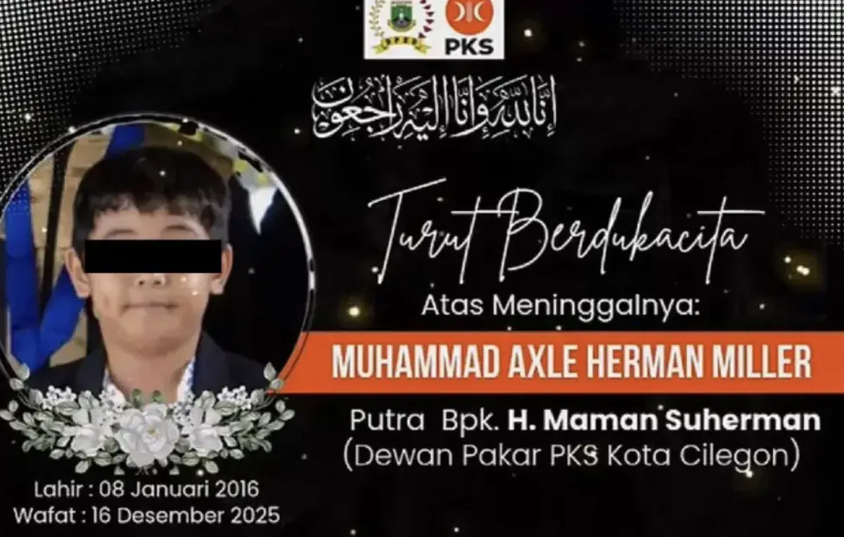 POSKOTA.CO.ID - Duka mendalam menyelimuti keluarga Maman Suherman, Dewan Pakar Partai Keadilan Sejahtera (PKS) Kota Cilegon. Anak laki-lakinya yang masih berusia 9 tahun ditemukan meninggal dunia secara tragis di kediaman keluarga.