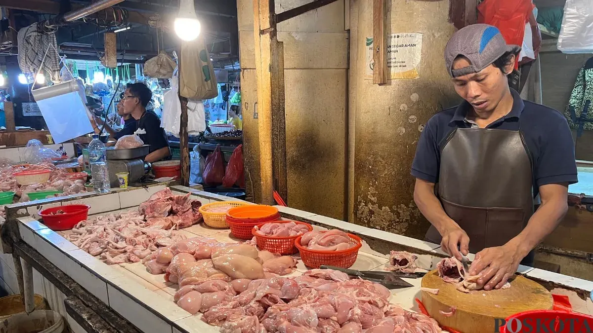 Pedagang daging ayam di Pasar Tomang Barat, Grogol Petamburan, Jakarta Barat, Sabtu, 20 Desember 2025. (Sumber: Poskota/Pandi Ramedhan)