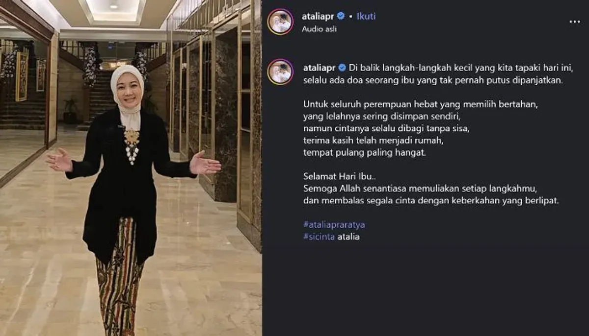 "Selamat Hari Ibu untuk perempuan-perempuan tangguh di seluruh Indonesia. Tetaplah bersinar dan mari saling menginspirasi," ujar Atalia Praratya di kutip Poskota, pada 23 Desember 2025.