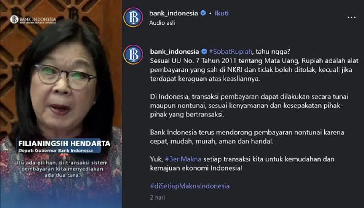 Bank Indonesia buka suara dan tegaskan aturan hukum, uang tunai Rupiah tidak boleh ditolak, menanggapi video viral penolakan pembayaran pada nenek di gerai Roti O. (Sumber: Instagram/@bank_indonesia)