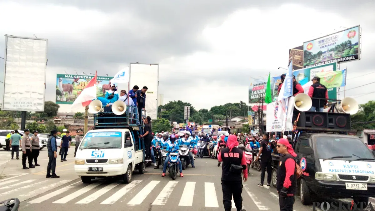 Pantauan Poskota di lokasi, ribuan massa aksi dari wilayah Tangerang Raya sudah berangkat menuju Kantor Gubernur Banten, Serang dengan melintasi jalan arteri.