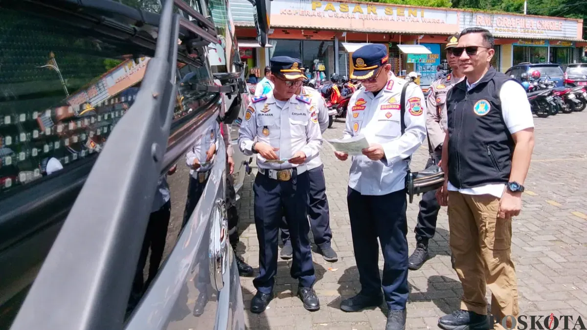Sejumlah bus pariwisata yang lalu lalang di kawasan wisata Lembang, Kabupaten Bandung Barat (KBB), Jawa Barat, tak luput dari razia petugas gabungan, Kamis 25 Desember 2025.