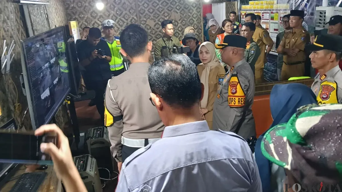 Bupati Serang Rachmatuzakiyah bersama Kapolres Serang saat melihat cctv kondisi arus lalulintas di Posyan Modern Cikande. (Sumber: Poskota/Rahmat Haryono)