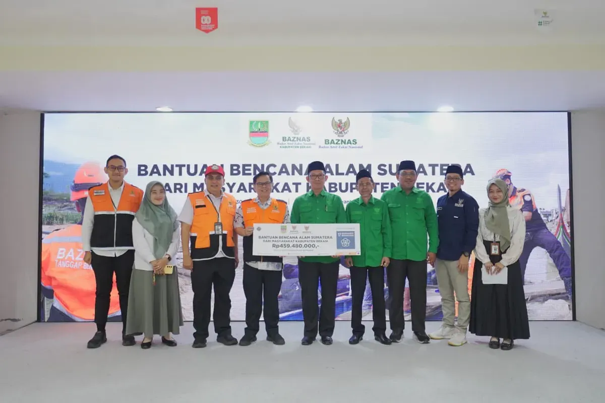 JAKARTA, POSKOTA.CO.ID - Badan Amil Zakat Nasional (BAZNAS) RI menerima bantuan kemanusiaan dari masyarakat Kabupaten Bekasi melalui BAZNAS Kabupaten Bekasi sebesar Rp459 juta untuk membantu penanganan bencana banjir bandang dan longsor di Aceh, Sumatra Utara, dan Sumatra Barat.
