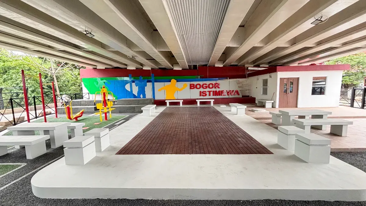Di kolong Flyover Cibinong yang tadinya digambarkan suram juga kumuh, kini disulap Pemkab Bogor menjadi sebuah taman yang memiliki sejumlah fasilitas olahraga didalamnya.