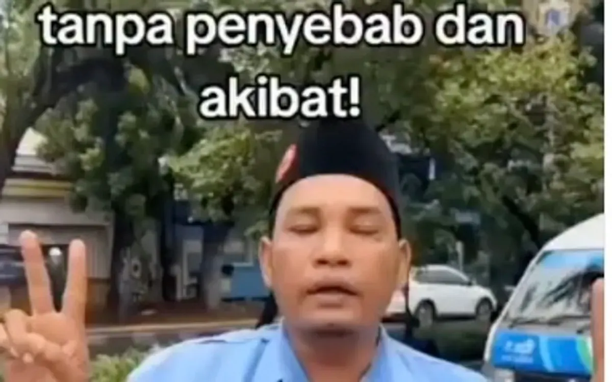 Di belakangnya terlihat armada JakLingko berwarna putih-biru yang terparkir di tengah jalan.