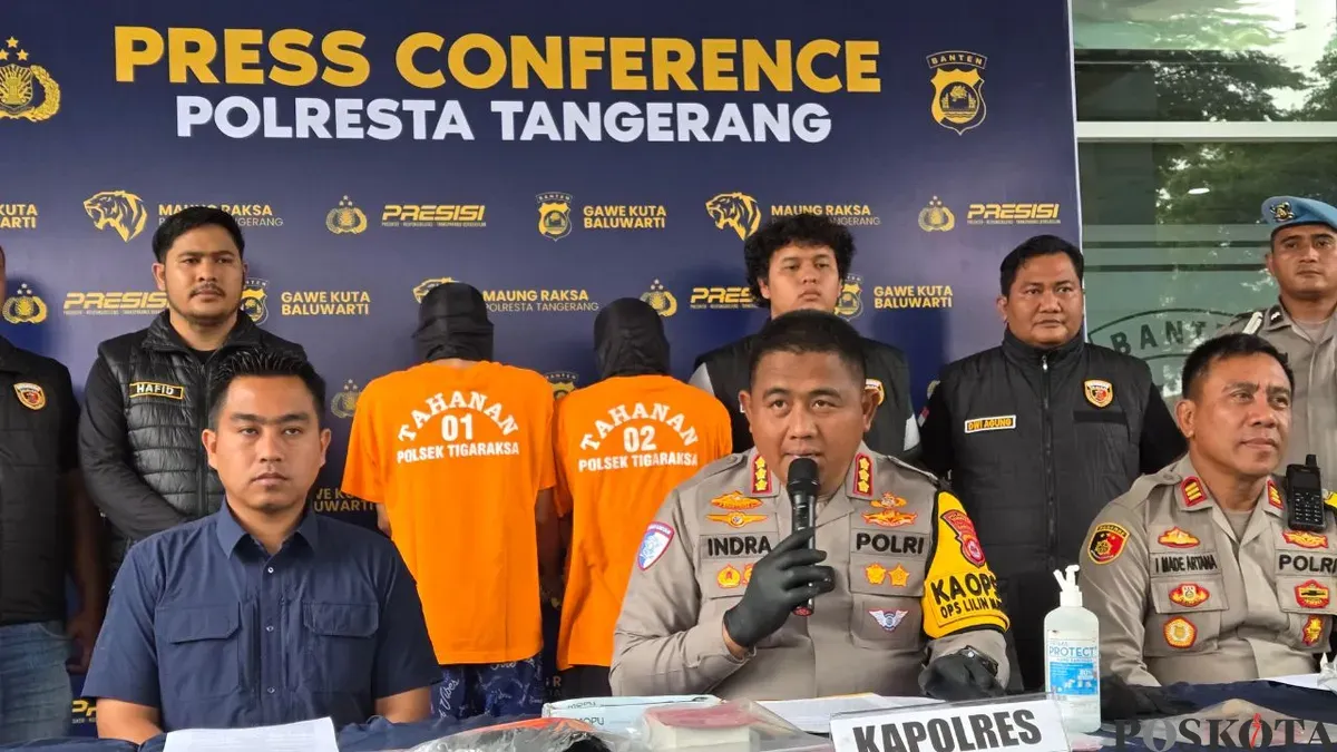 Kapolresta Tangerang, Kombes Pol Andi Muhammad Indra Waspada melakukan press release ungkap kasus pembunuhan. (Sumber: Poskota/Veronica Prasetio)