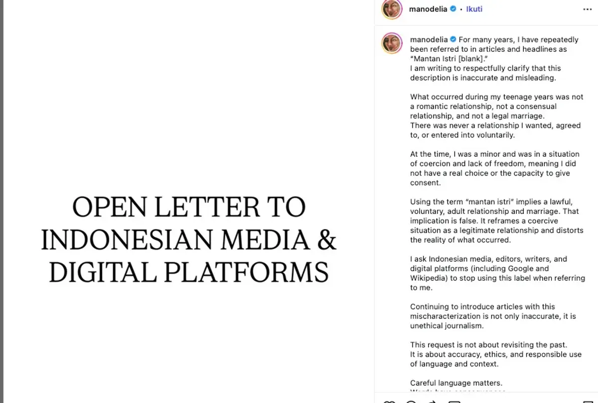 "Ketika seseorang mengalami kekerasan seksual, kita tidak menyebut mereka sebagai mantan pacar dari pelakunya," tulis Manohara pada unggahannya dalam bahasa Inggris pada Selasa, 6 Januari 2026.