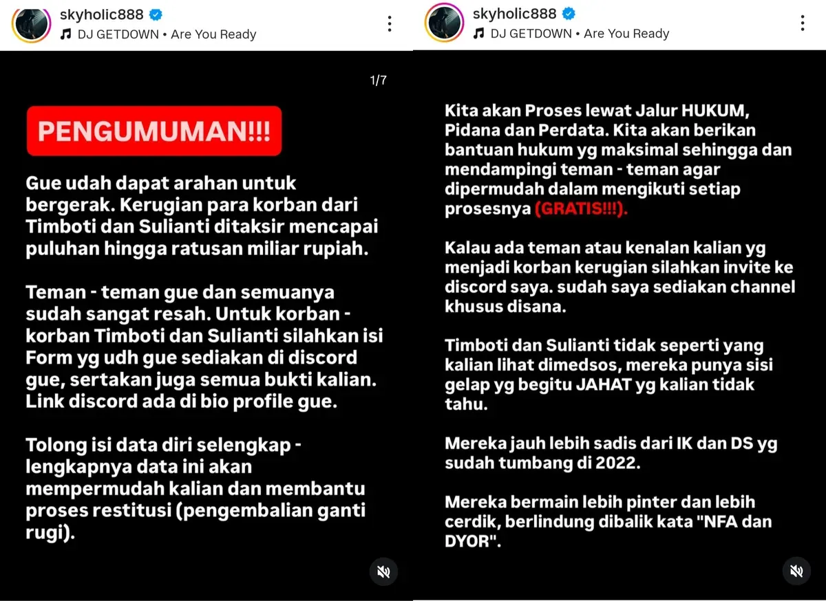 "Gue udah dapat arahan untuk bergerak. Kerugian para korban dari Timboti dan Sulianti ditaksir mencapai puluhan hingga ratusan miliar rupiah," isi postingan di akun @skyholic88.