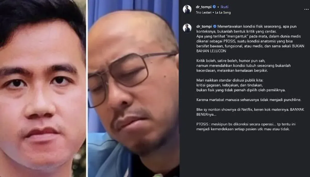 Materi tersebut memicu pro dan kontra, termasuk tanggapan dari penyanyi sekaligus dokter bedah plastik, Tompi. Lewat sudut pandang medis, Tompi menilai candaan tersebut kurang tepat dan berpotensi menyinggung kondisi fisik seseorang.