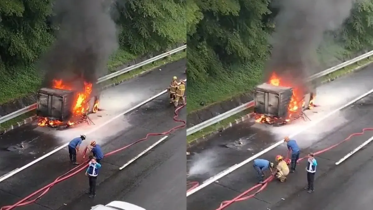 Sementara itu, sopir buru-buru keluar dari kendaraannya untuk menyelamatkan diri.