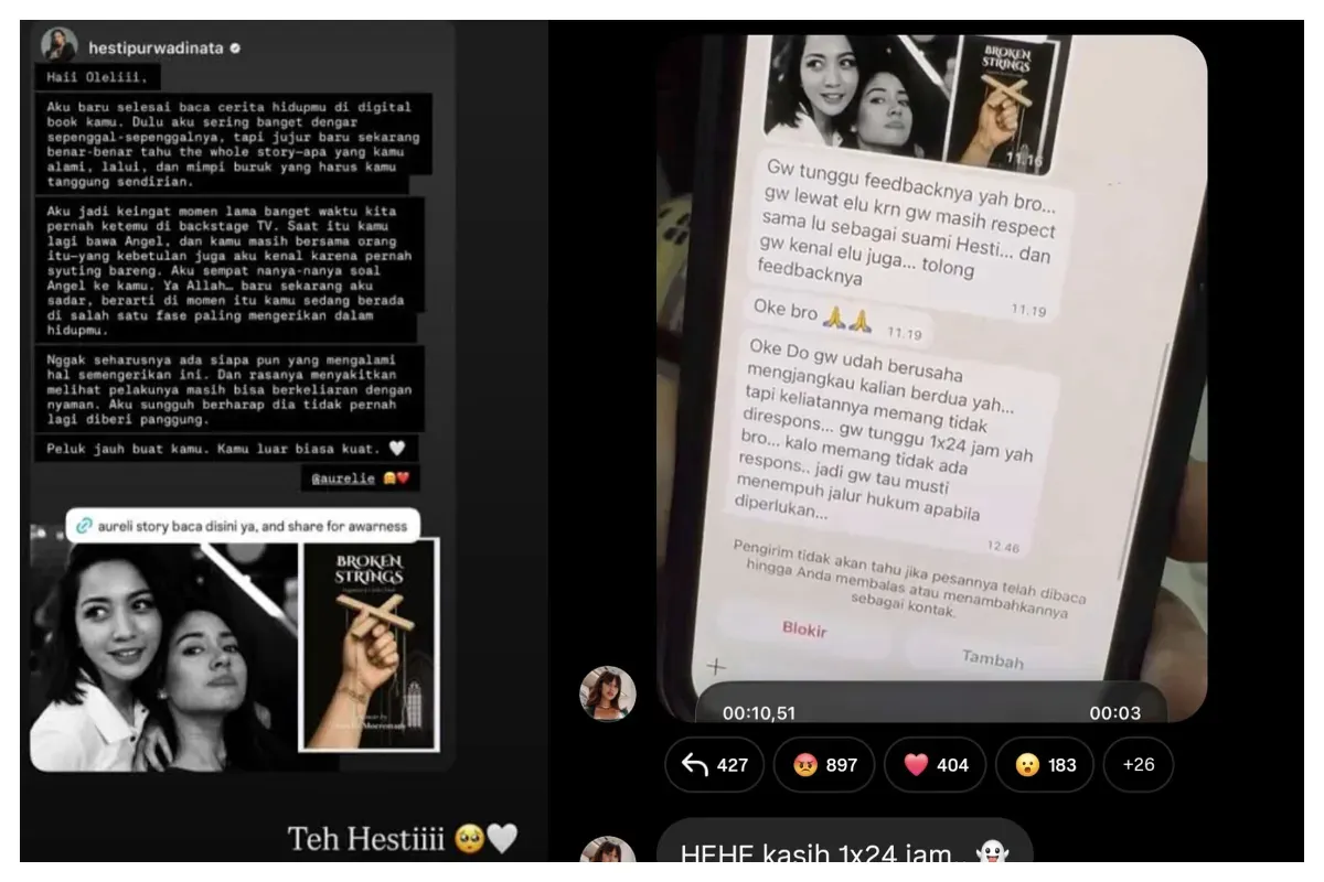 Dalam pesan tersebut, pengirim lebih dulu membagikan tangkapan layar Instagram Story Hesti yang berisi dukungan kepada Aurelie. Setelah itu, pesan bernada intimidatif pun disampaikan.