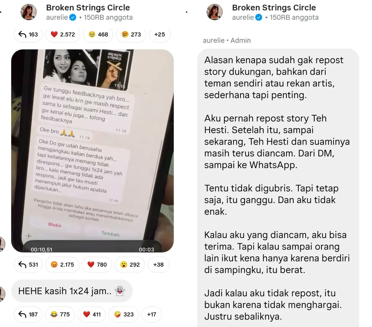 "Alasan kenapa sudah gak repost story dukungan, bahkan dari teman sendiri atau rekan artis, sederhana tapi penting. Aku pernah repost story Teh Hesti. Setelah itu, sampai sekarang, Teh Hesti dan suaminya masih terus diancam. Dari DM, sampai ke WhatsApp. Tentu tidak digubris. Tapi tetap saja, itu ganggu. Dan aku tidak enak," kata Aurelie dalam pesan yang dikirim di saluran Instagram nya, seperti dikutip Poskota, Senin, 12 Januari 2026.