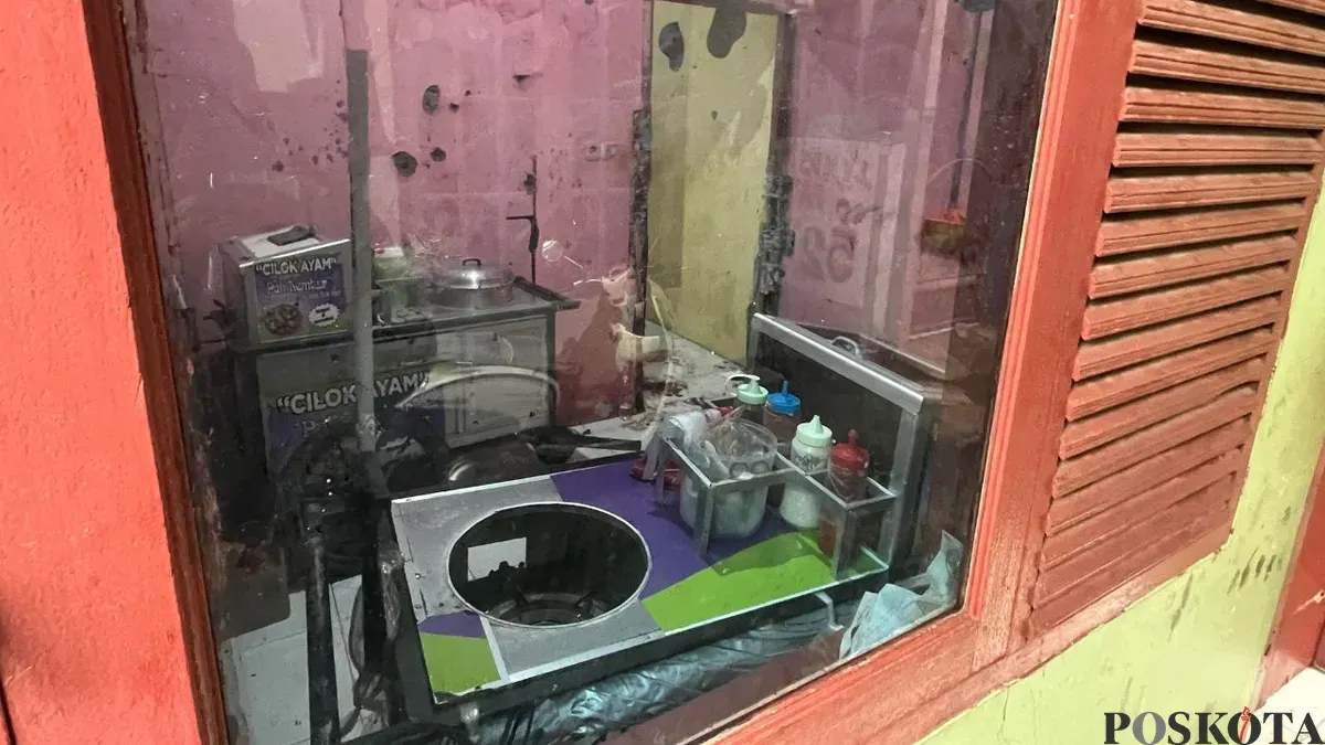 Dari luar terlihat beberapa gerobak cilok berada di rumah kontrakan tersebut, kemudian di lantai tampak bercak darah masih terlihat.