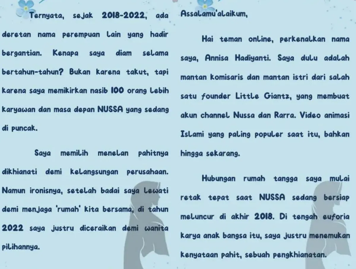 "Hai teman online, perkenalkan nama saya, Annisa Hadiyanti. Saya dulu adalah mantan komisaris dan mantan istri dari salah satu founder Nussa dan Rara," tulis Annisa, seperti yang tertera dalam tangkapan layar akun @oishi_tv, dikutip pada Jumat, 16 Januari 2026.