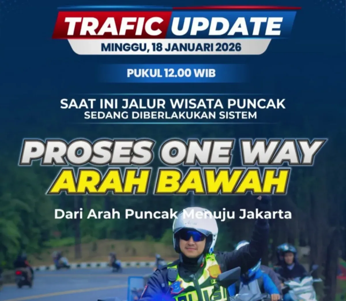 "Saat ini jalur wisata Puncak sedang diberlakukan sistem proses one way arah bawah dari arah Puncak menuju Jakarta," tulis Satlantas Polres Bogor di Instagram Story, seperti dikutip, Minggu, 18 Januari 2026.