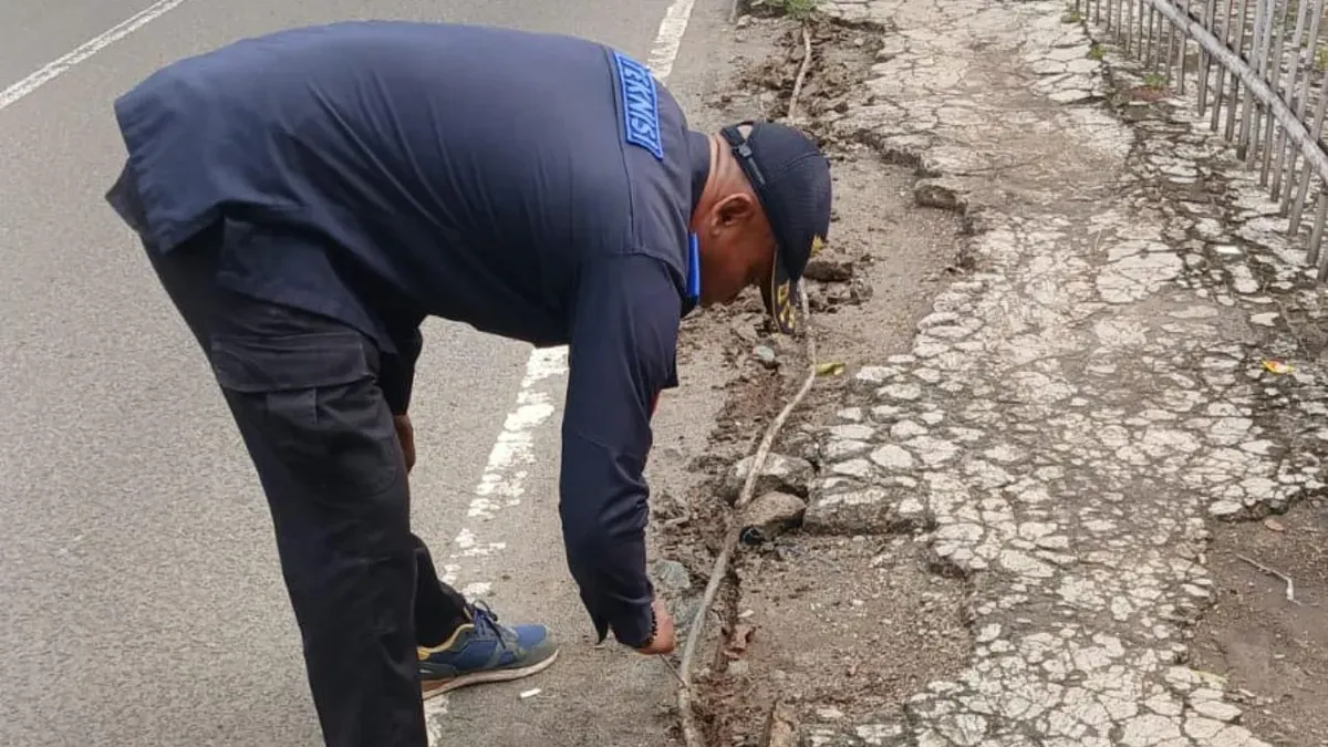 Petugas teknisi PJU Dinas Perhubungan Kota Depok sedang memperbaiki kabel tanam PJU di Jalan Raya Bogor, konslet hingga mengeluarkan asap putih. (Sumber: Dok. Polsek Cimanggis)