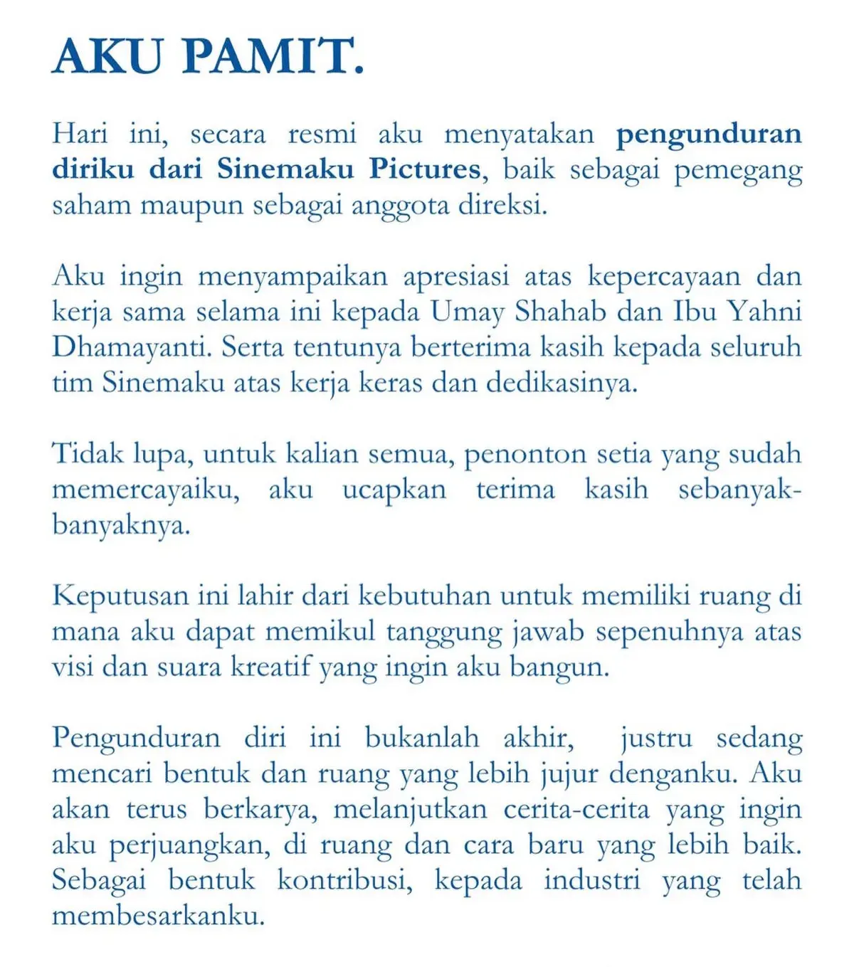 Dia menyampaikan bahwa pengunduran dirinya bersifat menyeluruh. Ia memastikan, tidak lagi terlibat baik sebagai pemegang saham maupun sebagai anggota direksi di rumah produksi tersebut.