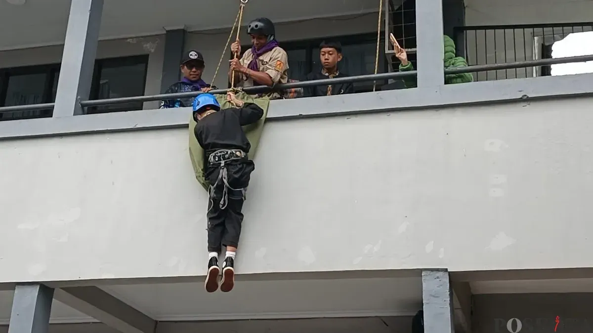 Petugas sekolah bersama sejumlah siswa bergerak cepat melakukan evakuasi menggunakan tandu. Bahkan, satu siswa harus dievakuasi dengan teknik vertical rescue lantaran mengalami cedera di lantai atas gedung sekolah. Beruntung, kejadian tersebut bukan gempa sungguhan.