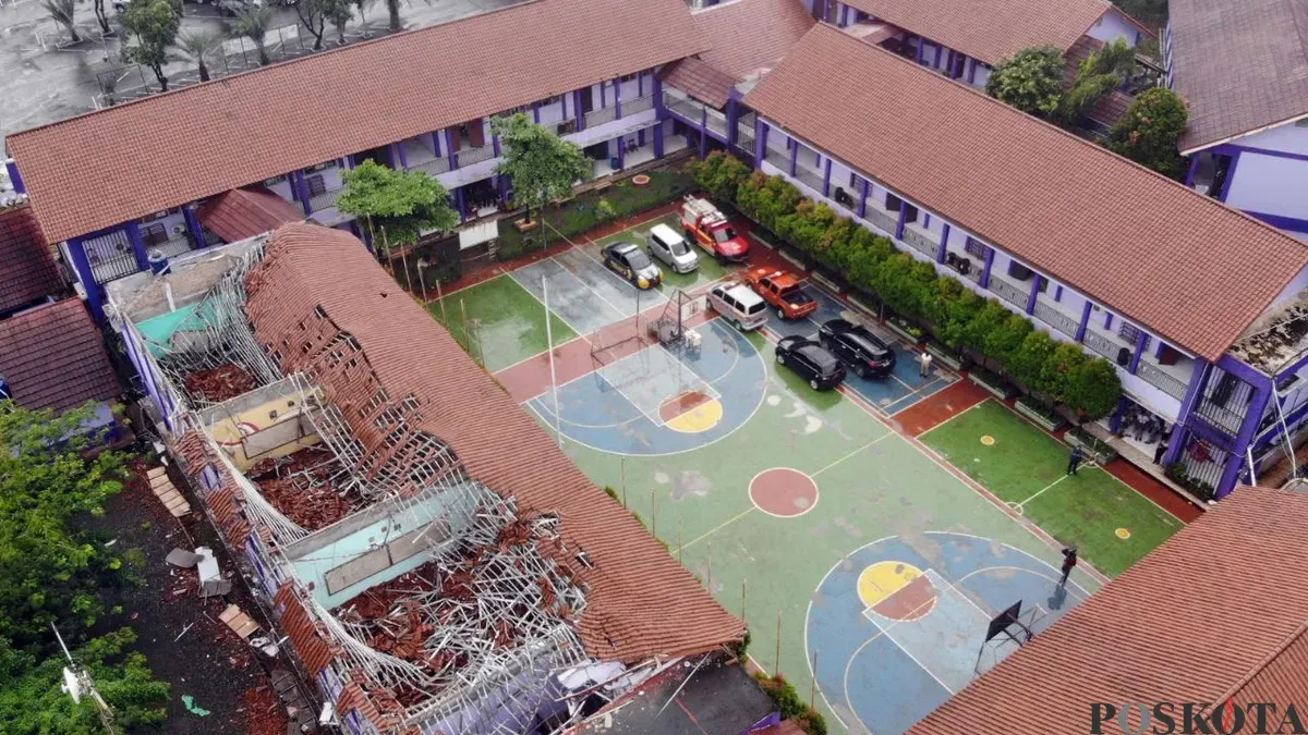 Pantauan Poskota di lokasi, terlihat bangunan yang di cat warna ungu itu tampak hancur, dengan puing-puing genteng dan baja ringan yang berserakan di bawah kelas.